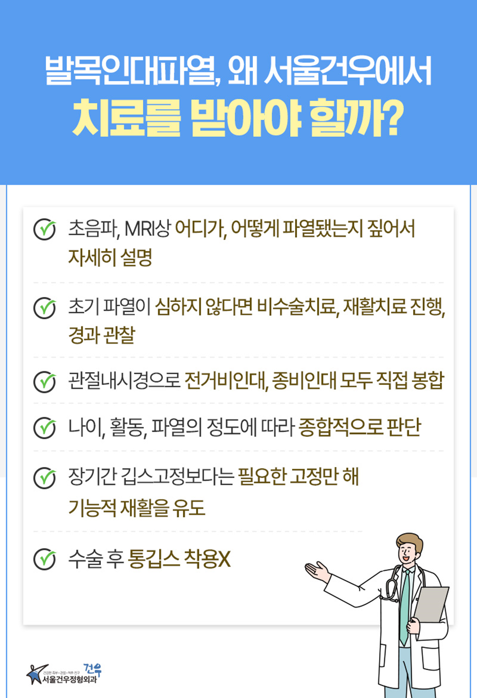 결론적으로, 발목인대파열은 일상생활과 운동 활동을 제약시키는 심각한 질병입니다. 조기에 전문가의 도움을 받고 적절한 치료를 받는 것이 중요하며, 무리한 운동이나 재발 위험이 있는 활동은 자제해야 합니다. 건강한 발목으로 일상을 즐기기 위해 치료의 중요성을 명심해야 합니다.